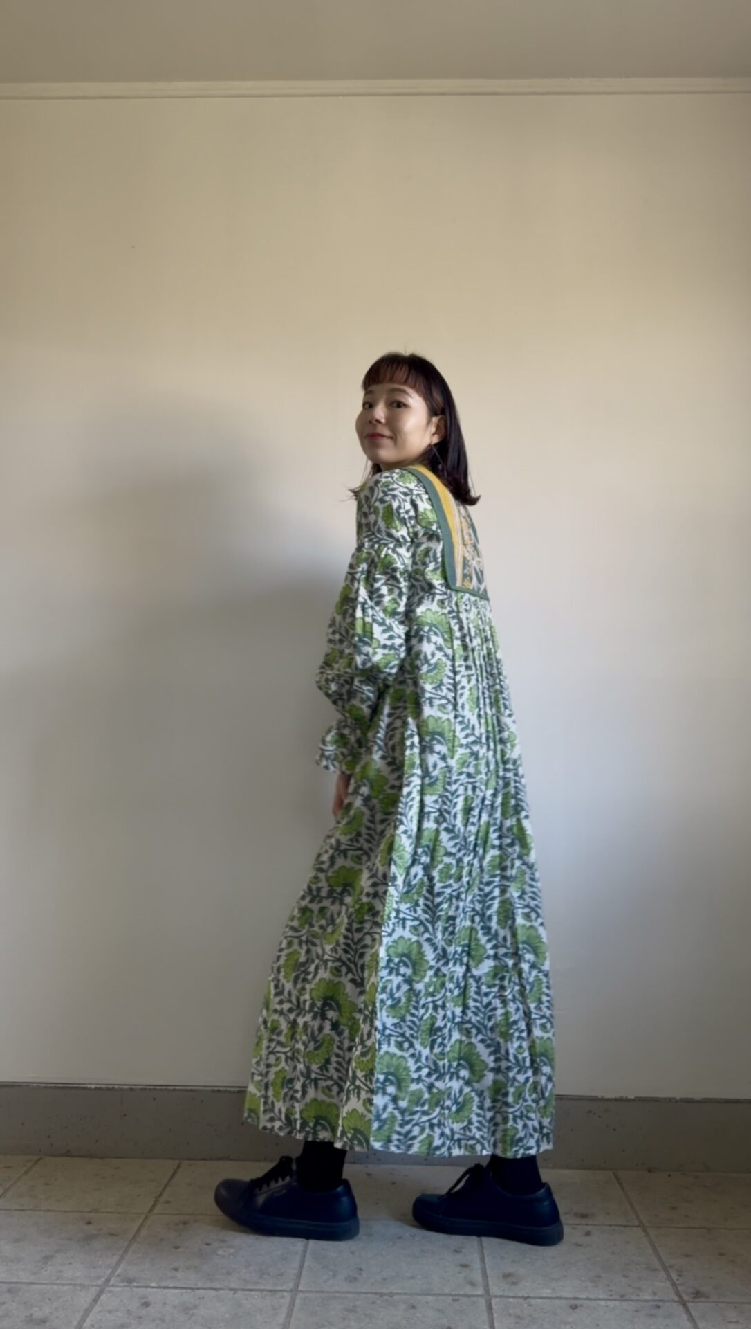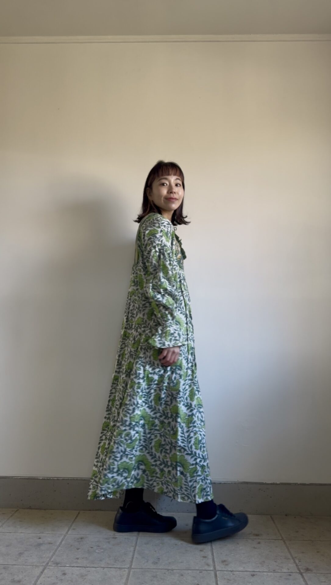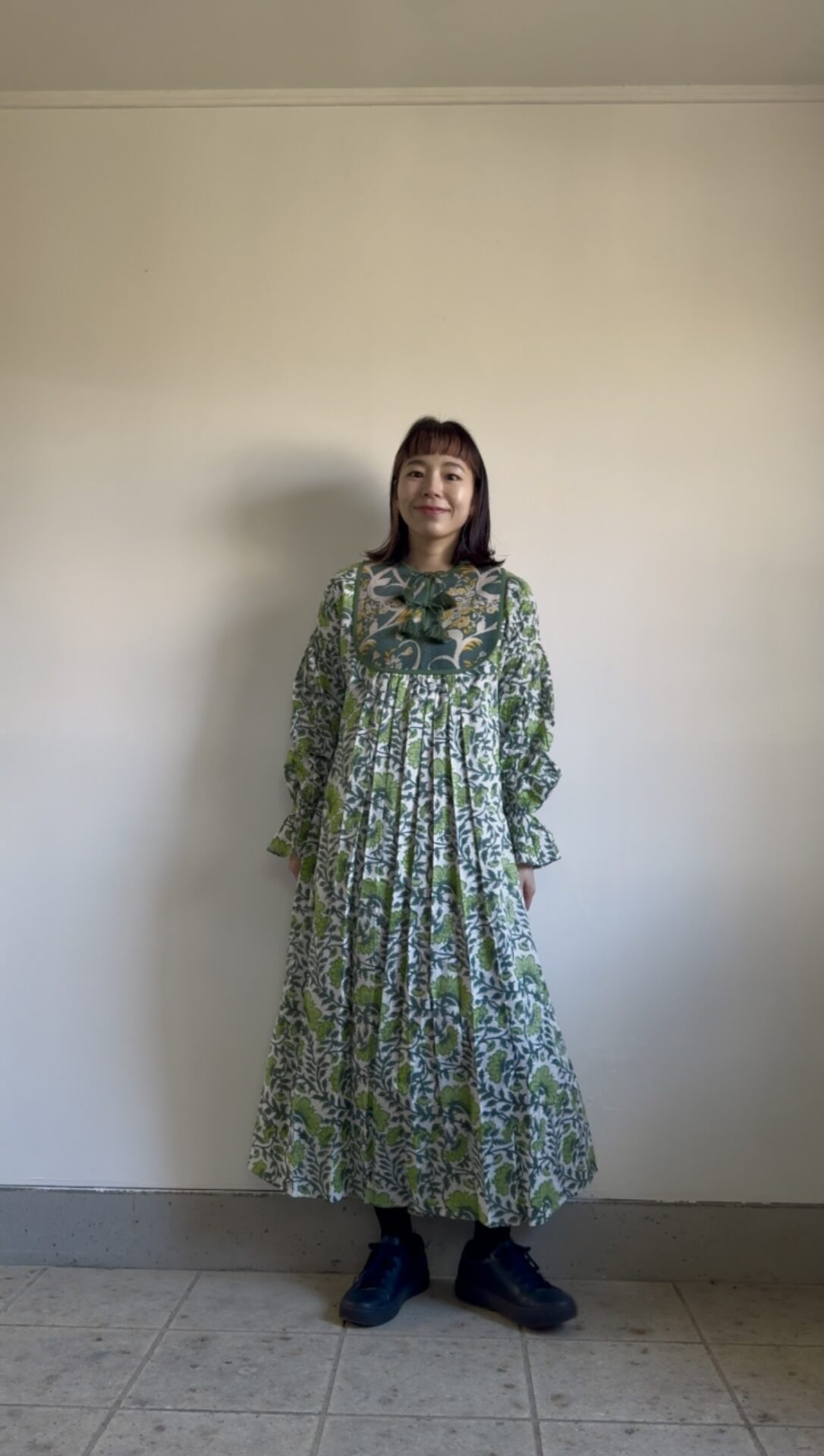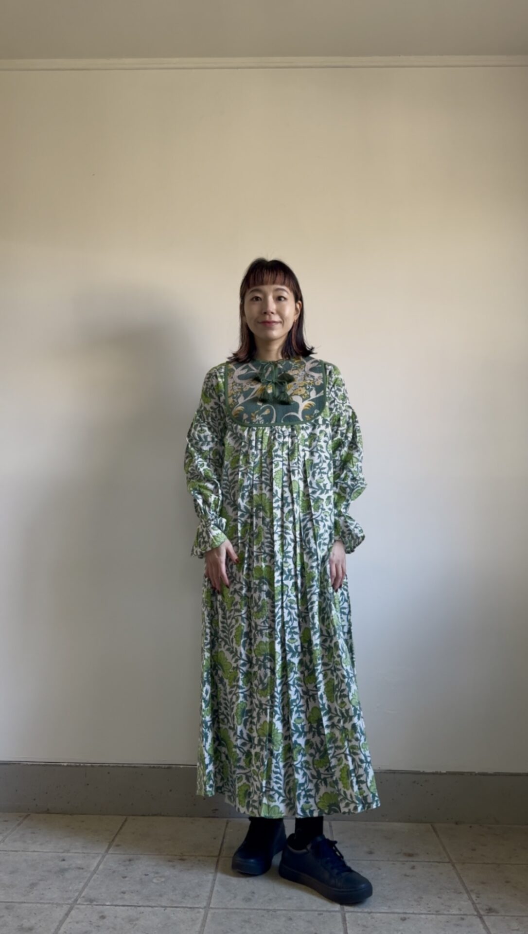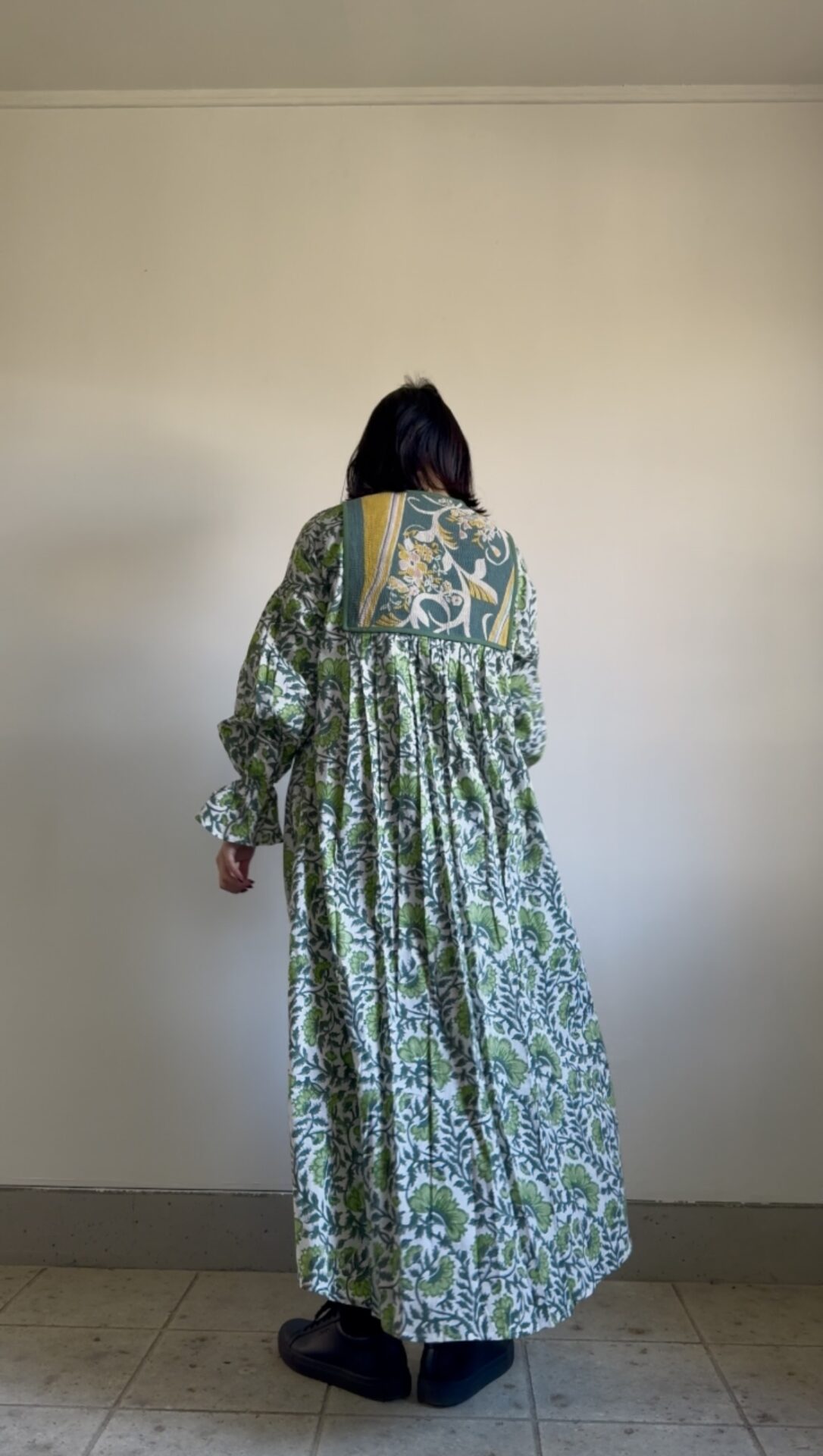 | サイズ | FREE 身幅57cm(周囲114cm) ウエスト78cm(周囲156cm) ゆき87cm 袖ぐり36cm 身丈 127cm (前身丈127cm / 後身丈131cm *中央にかけてシルエットが長くなっております) |